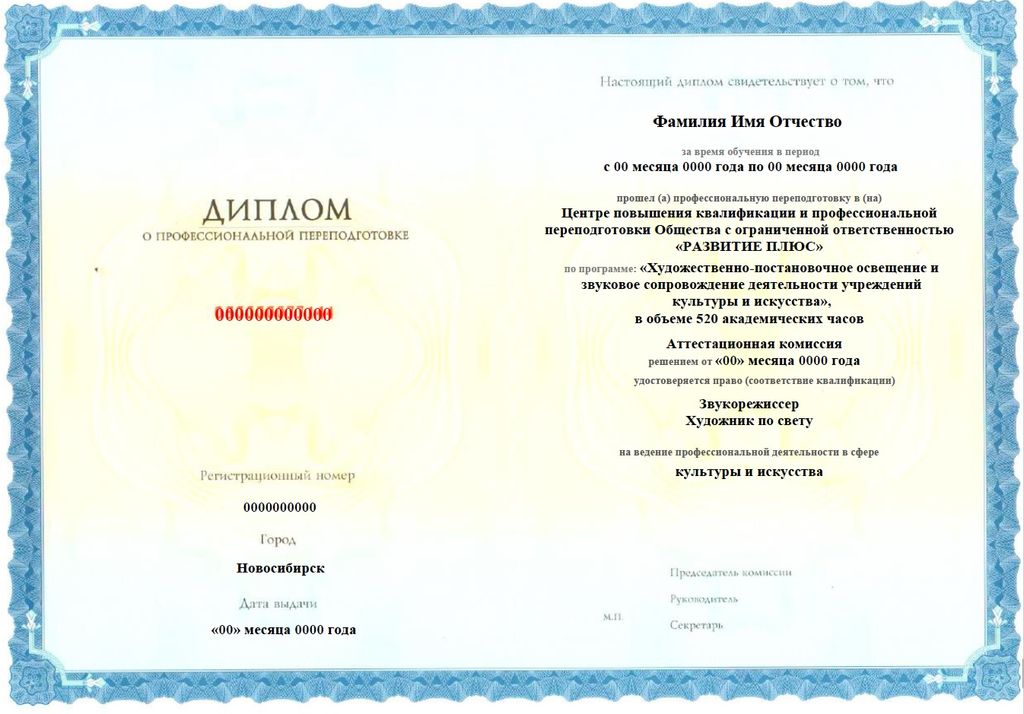 "Художественно-постановочное освещение и звуковое сопровождение деятельности учреждений культуры и искусства» с присвоением квалификации Звукорежиссер, художник по свету" 520 ак.ч.